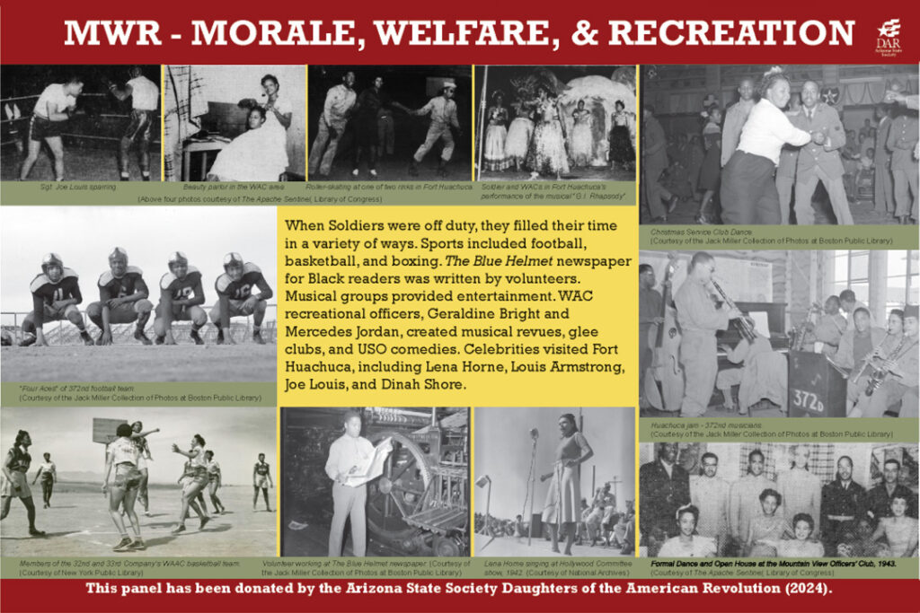 (Body) When Soldiers were off duty, they filled their time in a variety of ways. Sports included football, basketball and boxing. The Blue Helmet newspaper for Black readers was written by volunteers. Musical groups provided entertainment. WAC recreational officers Geraldine Bright and Mercedes Jordan created musical revues, glee clubs, and USO comedies. Celebrities visited Fort Huachuca, including Lena Horne, Louis Armstrong, Joe Louis, and Dinah Shore.